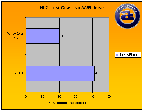 With no antialiasing and Bilinear anisotropic filtering, the 7600GT outperformed the PowerColor X1550 by quite a significant margin -- twice, to be exact.