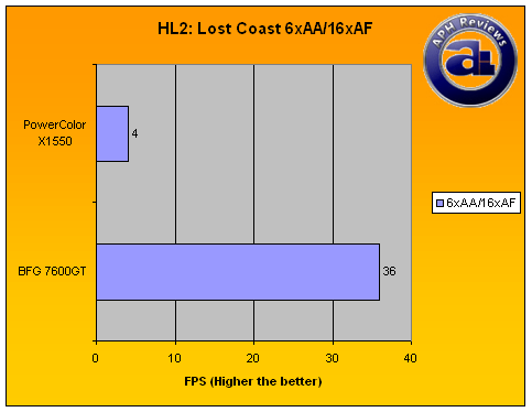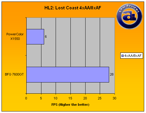 At maximum settings with Half-Life 2: Lost Coast, the PowerColor X1550 rendered the graphics at 4 frames per second. I don't know what happened here, but it seems to us that the 7600GT's frame rate actually rose -- the test has been rerun over 10 consecutive times with reboots in between with identical results.