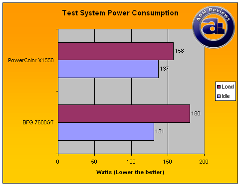 To measure power consumption, we've measured to overall power consumption of our test system during idle and load scenarios. The results are outlined in the graph above; and our results indicate that the BFG 7600GT OC consumes 131W during idle conditions -- while PowerColor's X1550 used 6W more power under the same scenario. On the other hand, the fluctuation is a lot less on the X1550 when compared to the 7600GT -- under load conditions, the total power consumption on our test system with the X1550 was 158W, while same scenario with the 7600GT was 180W.
