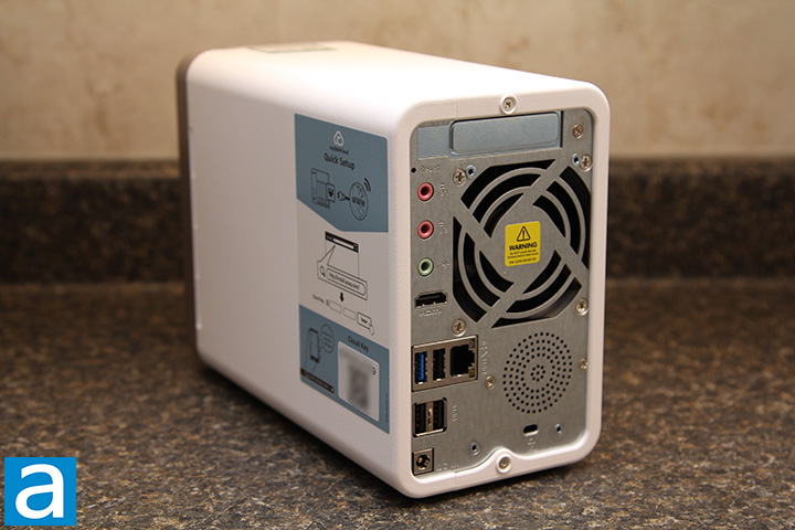 The QNAP TS-251B is constructed on a steel frame, while its shell that covers the remainder of the sides of the system is composed of white plastic. The textured plastic is reasonably resistant to fingerprints and scratches. What we have at the back of the system is simple but generous configuration of connectors. Here, we have one USB 3.0 port, three USB 2.0 ports, one HDMI 1.4b connector, one Gigabit Ethernet port, two 3.5mm dynamic microphone inputs, one 3.5mm speaker line out jack, and a DC 12V input from the external power brick. There is also a Kensington lock near the bottom. Occupying a large chunk of space at the back is a single 70mm exhaust fan to pull heat out of your NAS server. Exhaust vents are cut into the steel panel. In my opinion, a proper fan grille would have been better, but this should not affect cooling performance to a significant degree.