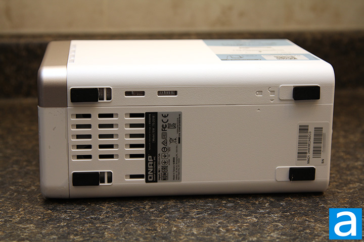 Even though the QNAP TS-251B features a white plastic cover, the NAS still features removable front-loaded drive trays like ASUSTOR's latest AS4002T and other devices based on the same chassis. In order to access the removable front-loaded drive trays, simply slide a tab lock down on the left, give it a quick tug, and the magnetic cover will pop right off. The tradeoff is the lack of ventilation slots on the front cover means cooling performance will be affected slightly. For the current design, airflow is over the hard drives driven by the rear mounted cooling fan inside the system and enters the NAS through ventilation slots at the bottom and on the side; more on this later.