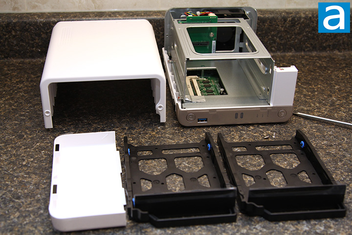 There is no wasted room inside the QNAP TS-251B network attached storage. We can see two 3.5" drive bays occupying majority of the area as well as the 70mm fan at the back. A centimeter or so of clearance room can be seen between the rear fan and the two hard drive bays. This allows some space between components to reduce heat congestion. At the top is an expansion card slot for QNAP's QM2 PCIe expansion card series, which features two M.2 SSD slots and 10GbE connectivity depending on variant. You can also use it for an AC2600 wireless card. The expansion card slot is native to the system-on-a-chip. Its well-placed rear exhaust fan can then easily take out the warm air and allow cooler air to flow over the mounted hard drives with minimal turbulence noise. A small passive heatsink is used to keep the processor running cool. The motherboard is mounted with its components facing inwards to take advantage of the airflow generated by the sole rear fan as well. Generally speaking, it is pretty packed inside the QNAP TS-251B, but everything is neatly placed and cabled to maximize cooling efficiency.