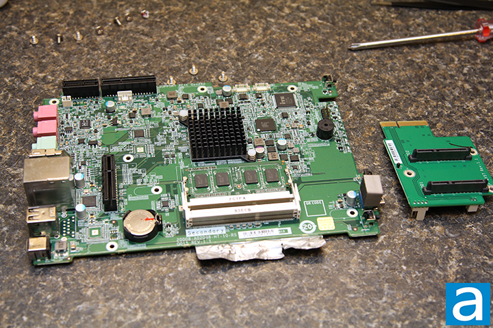 The user upgradeable memory slots can be seen above. Since this is the front of the motherboard, you can easily swap RAM on the system immediately after taking the shell off, which means you will not void your warranty. Our NAS came with 1x4GB of ADATA DDR3L-1866 double sided SODIMM using Micron D9SGQ ICs. From my experience, I never needed any more memory than my QNAP NAS already came with, but user upgradeable memory is always a good thing for more RAM intensive applications. This is especially useful if you are planning to use it as a virtualization box.
