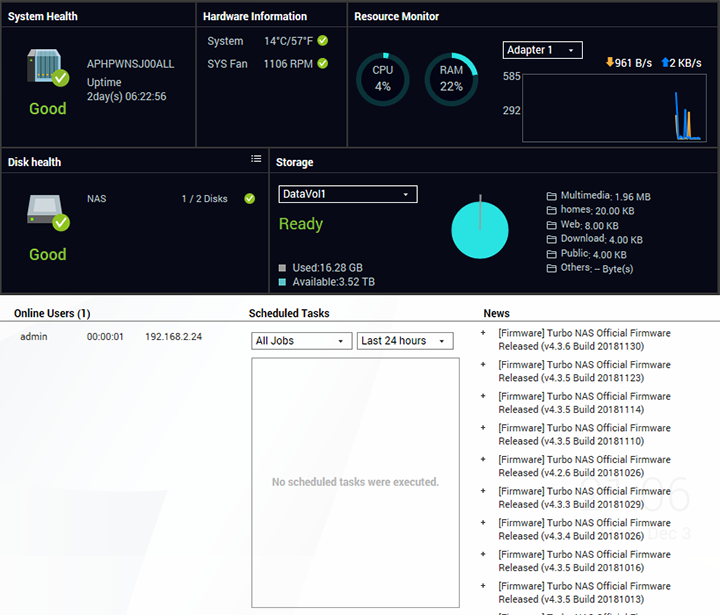 At the bottom half, online users are displayed here. A list with filter shows all the scheduled tasks. Finally, a feed containing latest QNAP news can be seen at the bottom right corner. Overall, I found the dashboard to be extremely useful; it provides vital system statistics all in one easy to access screen.