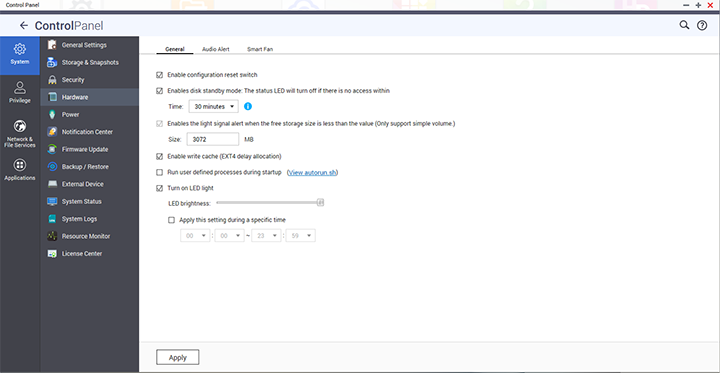 In the control panel, while I will not go over every menu, I will briefly go over most of them, since most of them are self-explanatory anyway. Expanding the first menu item is System Settings. General Settings allows the user to adjust server name and port, date and time syncing options, non-unicode file name encoding conversion, and login screen customization. Under the Security screen are four tabs: Security Level, Network Access Protection to prevent brute force password attacks for various services, Certificate & Private Key from a trusted provider, and Password Policy to set password strength rules. The screenshot above has the Hardware screen shown; permitting the user to configure aspects like disk standby mode, adjust LED brightness, and change fan speed settings.
