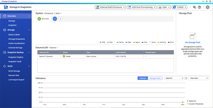Hitting Storage & Snapshots opens up an entirely new screen, as aforementioned. The screen shown above is the Overview screen. On the left, a menu allows you to switch between tabs to manage your hard drives, create storage pools, and manage RAID arrays. A Storage Pool is designed to amalgamate multiple hard drives into a large storage space and provide enhanced RAID protection for the volume. Under the Disks/VJBOD tab displays the state of the drive - a big, green "Good" is all you need to see -- along with information such as hard disk model, capacity, temperature, error recovery support, disk access history, and disk SMART information. In the Disk Health submenu are four tabs for the user to easily work with their HDD SMART diagnostic data. The SMART Information tab provides a summary table on diagnostic results. The Test tab gives the user an option to run a Complete or Rapid test immediately; while the final tab, Settings, can activate or deactivate a temperature alarm, as well as automatic scheduling automatic SMART tests. The Hard Disk Information submenu displays more detailed data, such as your drive's serial number and firmware version. Snapshots can be scheduled automatically to keep track of all your file changes. Up to 256 snapshots per volume can be made.