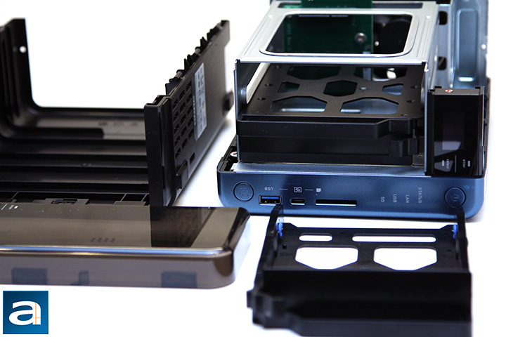 Intel's Celeron J3455 SoC provides native support to two of its USB 3.0 and SATA 6Gb/s ports. An ASMedia ASM1074 hub chip provides the remaining USB ports. One Gigabit LAN port is powered by Intel's WGI211AT controller, while the other is supplied by a Realtek RTL8153 controller. A Realtek ALC262 audio codec handles the 3.5mm output and inputs at the back. All of these mentioned parts are soldered directly to the motherboard. The system firmware is stored on a Winbond 25Q16DVS1G flash chip.