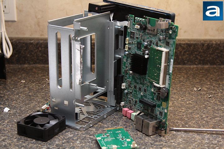 There is no wasted room inside the QNAP TS-253B network attached storage. We can see two 3.5" drive bays occupying majority of the area as well as the 70mm fan at the back. A centimeter or so of clearance room can be seen between the rear fan and the two hard drive bays. This allows some space between components to reduce heat congestion. At the top is an expansion card slot for QNAP's QM2 PCIe expansion card series, which features two M.2 SSD slots and 10GbE connectivity depending on variant. The expansion card slot is powered by an ASMedia ASM1182e switch. Its well-placed rear exhaust fan can then easily take out the warm air, and allow cooler air to flow over the mounted hard drives with minimal turbulence noise. A small passive heatsink is used to keep the processor running cool. The motherboard is mounted with its components facing inwards to take advantage of the airflow generated by the sole rear fan as well. Generally speaking, it is pretty packed inside the QNAP TS-253B, but everything is neatly placed and cabled to maximize cooling efficiency.