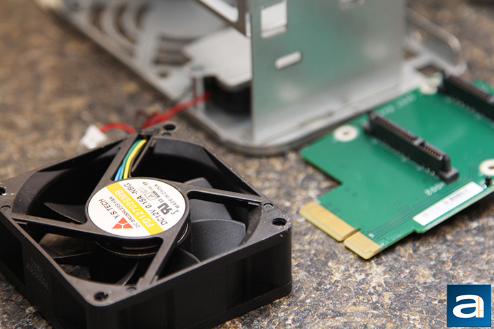 The SATA backplane ports are powered by a controller native to the Intel system on a chip. Meanwhile, the rear exhaust fan is an Y.S. Tech FD127025MB, which is a 70mm dual ball bearing fan specified at 0.15A for a maximum of speed of 4000 rpm. The rated airflow is 33.1 CFM and 5.0 mm-H2O static pressure at 34.5 dB of noise. This is similar to the one found in the AS3202T, except designed for quieter operation.