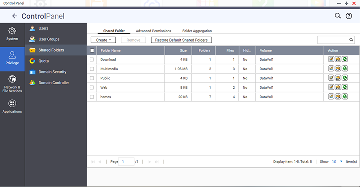 Continuing in the Control Panel, under the Privilege folder tree are six options: Users, User Groups, Share Folders, Quota, Domain Security, and Domain Controller. The Domain Security section provides different authentication options, including local user, active directory, and LDAP authentication. Domain Controller allows you to enable or disable this feature, as well as change its domain name, domain username, and password. In the Users screen, a table lists all users in the system, as well as their respective independent disk quota and account options. You will also have the option to search, create, multiple create, import, and delete accounts here. Five icons represent five different account functions; of which they are Change Password, Edit Account Profile, Edit User Groups, Edit Shared Folder Permission, and Edit Application Privilege. In the Shared Folders screen, it lists an array of folders on the system, similar to the table displayed for the Users screen as shown above. It also shows each folder's size, folders within, number of files, and if it is hidden in their respective column. Again, there are three management options for each folder: Edit Properties, Edit Shared Folder Permissions, and Refresh. Pulling up the Properties menu gives you the option to set the folder's path (If you have multiple single disks installed, you can also set which drive it belongs to), hide or show the folder, as well as locking the file. You can also do stuff enable write-only accesses over FTP and enable sync. The Quota screen allows you to configure universal disk quotas. Individual disk quotas can be set in the Users section.