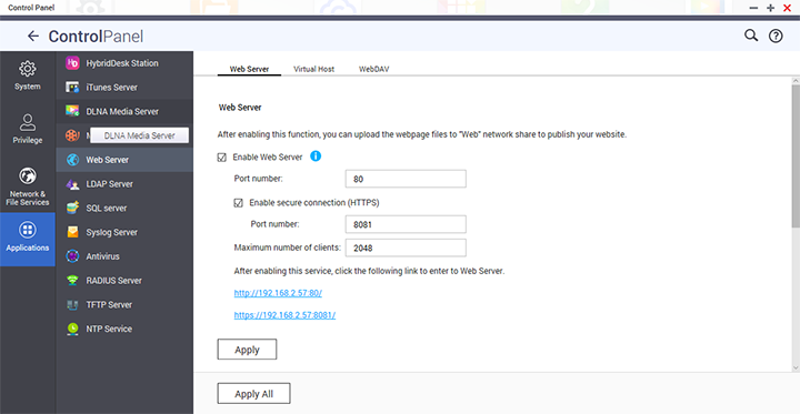 Lastly, the Applications submenu shown above is quite straightforward as well. Most of the listed sections, as you can see in our image above, are simply used to enable or disable their respective services. In the Web Server screen shown above, you can enable or disable its HTTP server, set its default public port, enable/disable WebDAV, and upload, edit, or restore the php.ini maintenance file. One to note in particular is the SQL server -- the QNAP TS-253B has built in MariaDB support, as well as an option to install phpMyAdmin using the App Center, in which we will talk about later.