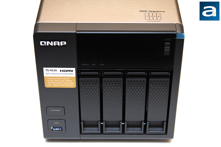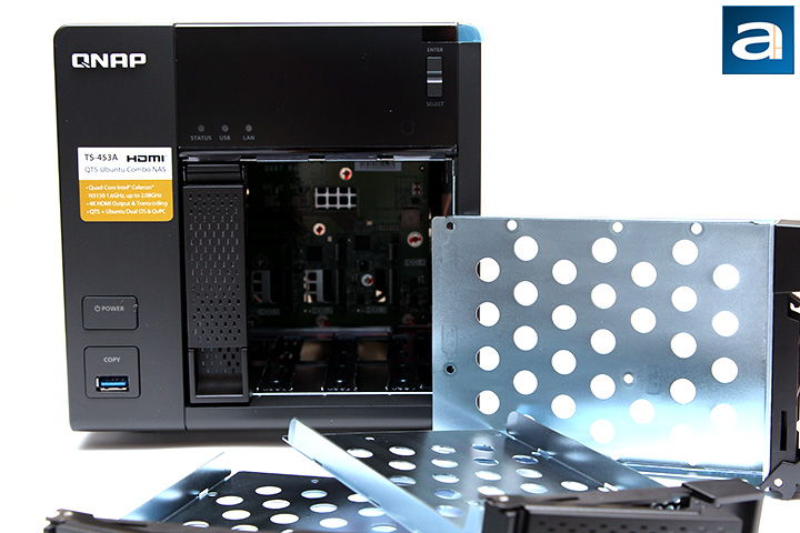The QNAP TS-453As external design is practically identical everything in the same line of products we have reviewed from company in the past. This means it carries a strong family resemblance to everything ranging from the QNAP TS-439 Pro to the TVS-463. Interestingly, even though it is a product in the company's small business lineup, the QNAP TS-453A is much closer to the consumer TS-419P II than anything else. This means unlike QNAP's professional grade devices, the TS-453A does not have lockable drive trays. Furthermore, it features an external power supply brick rather than an internal power supply. There is an advantage to this; as its heat source is placed outside the system, you will get improved thermal efficiency in operation.