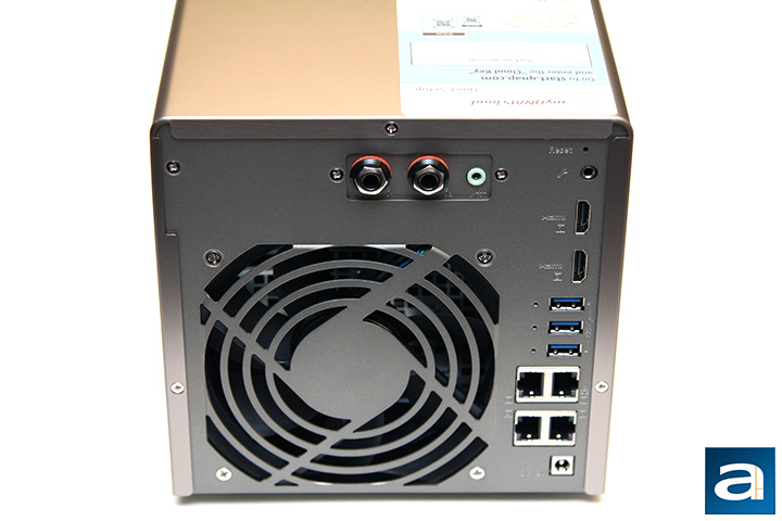 The connection array at the back is simple yet generous; where you are provided three USB 3.0 ports for storage, up to three printers, or peripherals. Two HDMI 1.4a ports are present for duplicating or extending your desktop; no HDMI 2.0 here though, unfortunately. Four integrated Intel Gigabit LAN ports reside below the USB ports. You can configure them for maximum performance, network redundancy, load balancing, and even multiple independent networks. The socket at the bottom right corner accepts the 12V DC input from the external 96W power brick. Meanwhile, a large single 120mm YS Tech FD121225LB exhaust fan pulls heat out of your NAS server, with its exhaust vents cut into the steel panel. A proper fan grille would be better for airflow in my opinion. More information on this fan will be explored on the next page.