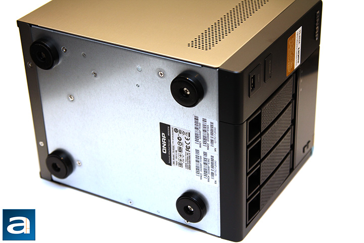 There is nothing particularly exciting at the bottom of the QNAP TS-453A's chassis; what you will see here are four large legs affixed on top of its steel frame panel. As always, they are installed to reduce vibration noise, increase grip, and prevent surface scratching. The left side of the network attached storage system features a neat array of small openings on its brushed aluminum shell. It is placed right next to where the motherboard is inside, to make sure hot air does not get congested within.