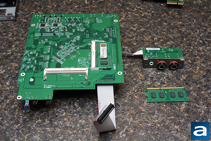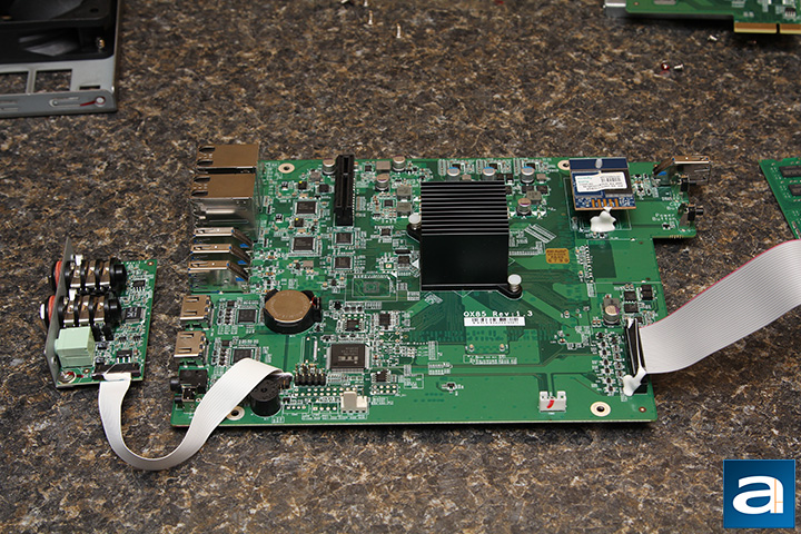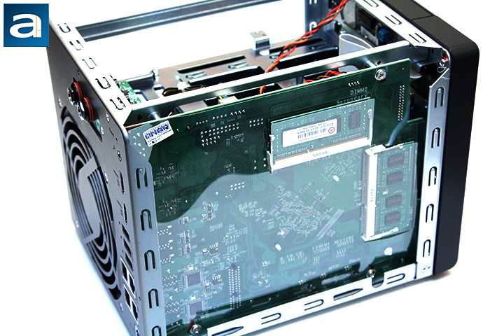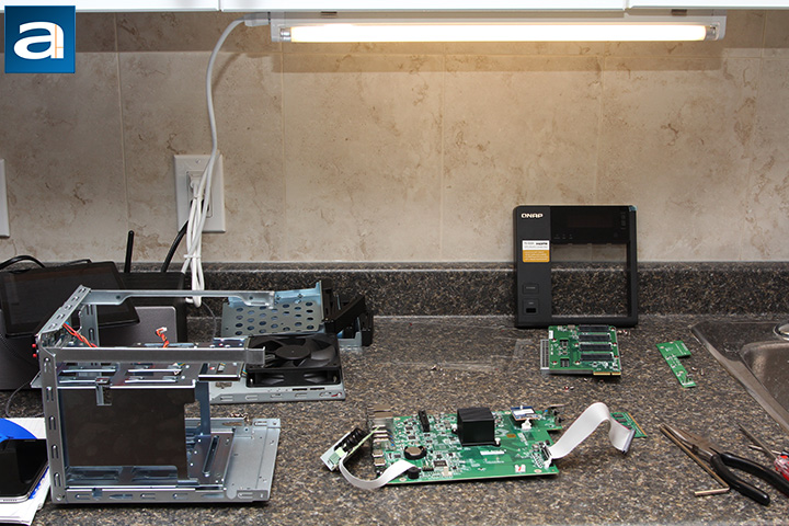 Unless you are someone determined to void your warranty and persistent enough to rip your new $600 file server apart, it is actually quite a challenge to dig into the further details on this product. I bet the guy who designed the chassis was probably thinking to himself, "No one is going to take this product apart, but if someone tries, I will make their life as hard as possible." As it has always been, QNAP has 'conveniently' made everything interlocking -- for example, the motherboard cannot be removed unless you release a screw hidden behind the front panel as well as the SATA backplane, which the latter cannot be taken out by itself, since it is blocked off by the chassis frame and power supply. But if you are as inclined as I have, then a bit of persistence and thirty minutes of time will prove to be quite rewarding. (It took me almost two hours with my first QNAP, but with some experience, half an hour was good enough this time around.) After removing the power supply and disengaging the chassis back panel, remove four screws on the SATA backplane. You can now slide it out by moving it to the left. Take out all the screws at the back of the motherboard, disconnect all the cables, and remove six more screws to take out the front panel. A screw next to the front panel controls will allow you to take the motherboard out entirely. Now we can finally really take a closer look at the hardware under the hood.