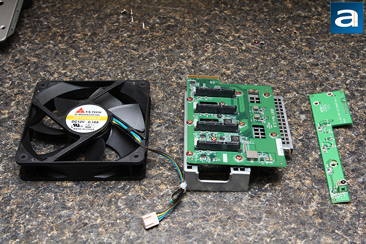 Lastly, we have the rear 120mm fan, SATA backplane, and front panel LED board. The front panel LED board is even labeled "TS-470 PRO" on the silkscreen. All ports on the SATA backplane are SATA 6Gb/s ports supplied by a pair of Marvell 88SE9215 controllers. An ASMedia ASM1466 SATA repeater chip is found to ensure data signal quality and integrity. On the left, the YS Tech FD121225LB is a 120mm ball bearing PWM fan specified at 0.18A for a maximum of speed of 1800 rpm. The rated airflow is 73 CFM and 2.6 mm-H2O static pressure at 34 dB of noise.