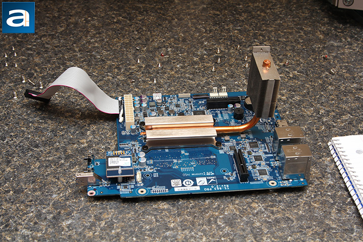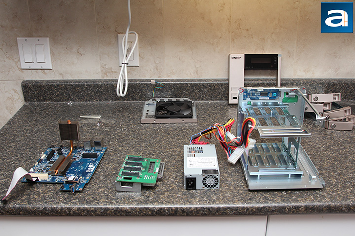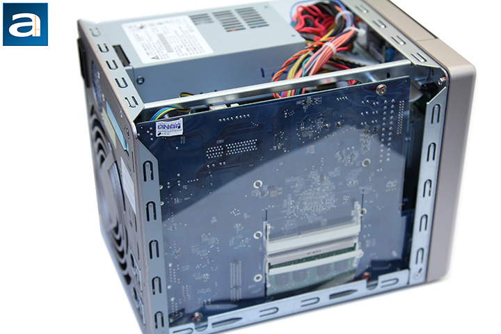 Unless you are someone determined to void your warranty and persistent enough to rip your new $800 file server apart, it is actually quite a challenge to dig into the further details on this product. I bet the guy who designed the chassis was probably thinking to himself, "No one is going to take this product apart, but if someone tries, I will make their life as hard as possible." As it has always been, QNAP has 'conveniently' made everything interlocking -- for example, the motherboard cannot be removed unless you release a screw hidden behind the front panel as well as the SATA backplane, which the latter cannot be taken out by itself, since it is blocked off by the chassis frame and power supply. But if you are as inclined as I have, then a bit of persistence and thirty minutes of time will prove to be quite rewarding. (It took me almost two hours with my first QNAP, but with some experience, half an hour was good enough this time around.) After removing the power supply and disengaging the chassis back panel, remove six screws on the SATA backplane. You can now slide it out by moving it to the left. Take out all the screws at the back of the motherboard, disconnect all the cables, and remove six more screws to take out the front panel. A screw next to the front panel controls will allow you to take the motherboard out entirely. Now we can finally really take a closer look at the hardware under the hood.