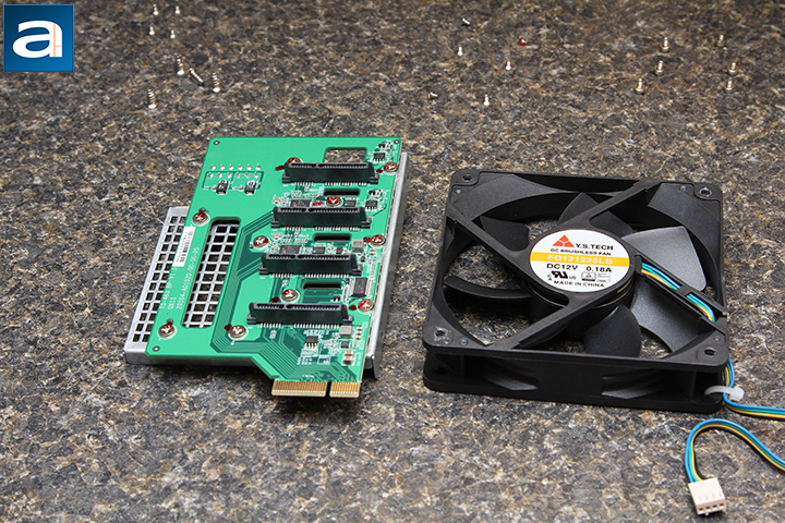 Lastly, we have the SATA backplane, and the rear 120mm fan. All of them are SATA 6Gb/s ports supplied by a pair of Marvell 88SE9215 controllers. On the right, the YS Tech FD121225LB is a 120mm ball bearing PWM fan specified at 0.18A for a maximum of speed of 1800 rpm. The rated airflow is 73 CFM and 2.6 mm-H2O static pressure at 34 dB of noise.