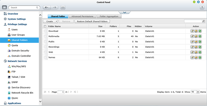 Continuing in the Control Panel, under the Privilege folder tree are six options: Users, User Groups, Share Folders, Quota, Domain Security, and Domain Controller. The Domain Security section provides different authentication options, including local user, active directory, and LDAP authentication. Domain Controller allows you to enable or disable this feature, as well as change its AD server name, domain name, domain username, and password. In the Users screen, a table lists all users in the system, as well as their respective independent disk quota and account options. You will also have the option to search, create, multiple create, and delete accounts here. Four icons represent four different account functions; of which they are Change Password, Edit Account, User Groups, and Private Network Share. In the Shared Folders screen, it lists an array of folders on the system, similar to the table displayed for the Users screen as shown above. It also shows each folder's size, folders within, number of files, and if it is hidden in their respective column. Again, there are three management options for each folder: Properties, Access Permissions, and Refresh. Pulling up the Properties menu gives you the option to set the folder's path (If you have multiple single disks installed, you can also set which drive it belongs to), hide or show the folder, as well as locking the file. You can also enable write-only accesses over FTP. The Quota screen allows you to configure universal disk quotas. Individual disk quotas can be set in the Users section.