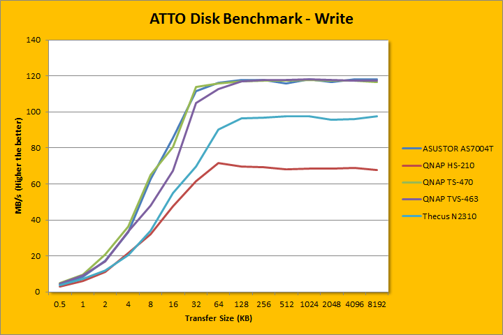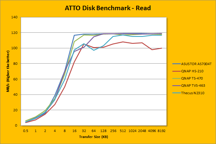 ATTO disk benchmark provides valuable insight into evaluating disk performance; it is especially valuable since it is not local disk limited like Windows file copy -- but rather the network adapter itself. After first using it in our QNAP TS-559 Pro+ review nearly five years ago, ATTO has been an integral part of our storage benchmarks; used in everything ranging from USB flash drives to solid state disks. Venturing in the area of 118.776MB/s in read and 117.993MB/s write for pretty much everything 64K and up, remember that the theoretical maximum of Gigabit Ethernet is 'only' 125MB/s (1000Mbps / 8) with overhead -- this is about as fast as it gets. Under the curve, it is a little slower than the ASUSTOR AS7004T and QNAP TS-470. At peak, the QNAP TVS-463 is limited only by the network interface, and not the performance of the NAS itself. At the end of the day, this is still a seriously fast system.