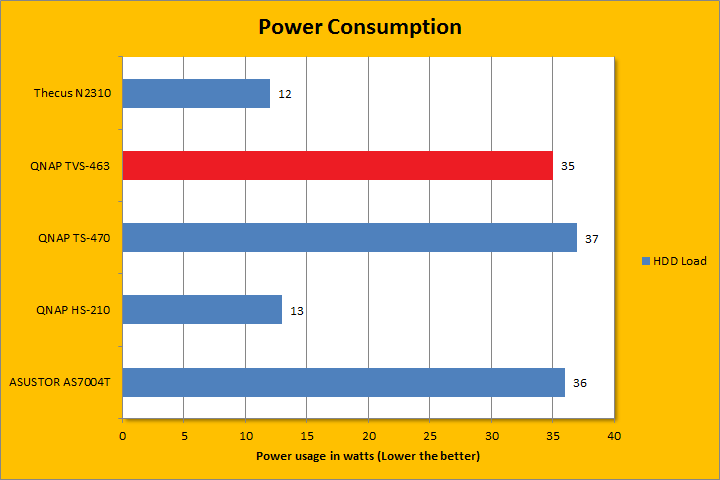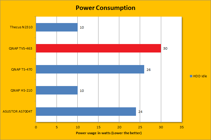 With one Seagate NAS hard drive installed, power consumption for our specific configuration is only 35W under load, which is slightly better than the ASUSTOR AS7004T and QNAP TS-470. However, its idle power is considerably higher than its Intel based counterparts; the AS7004T with a Core i3-4330 and TS-470 with an Intel Celeron G550 both consumed considerably less wattage in the same conditions. Power consumption will drop if the hard drives are configured to turn off if they are not used, or when the QNAP TVS-463 is sent into standby mode, but 30W of idle power leaves a bit to be desired. Considering it is going to be running 24/7, every watt will definitely add up.