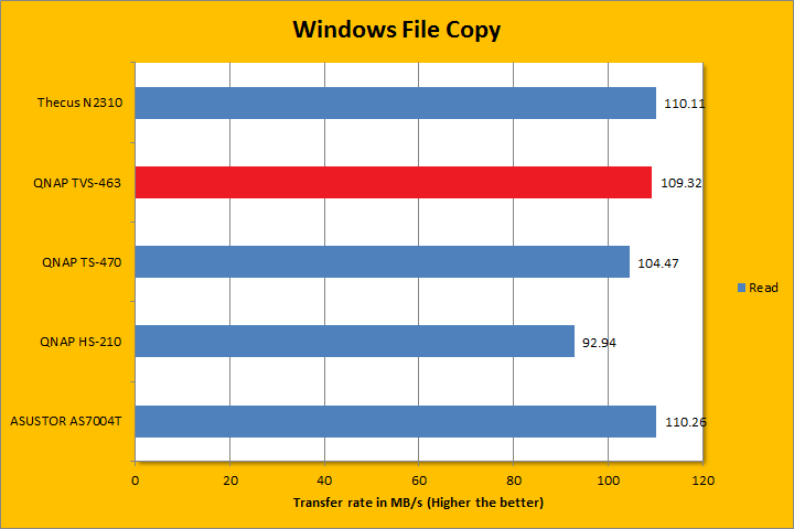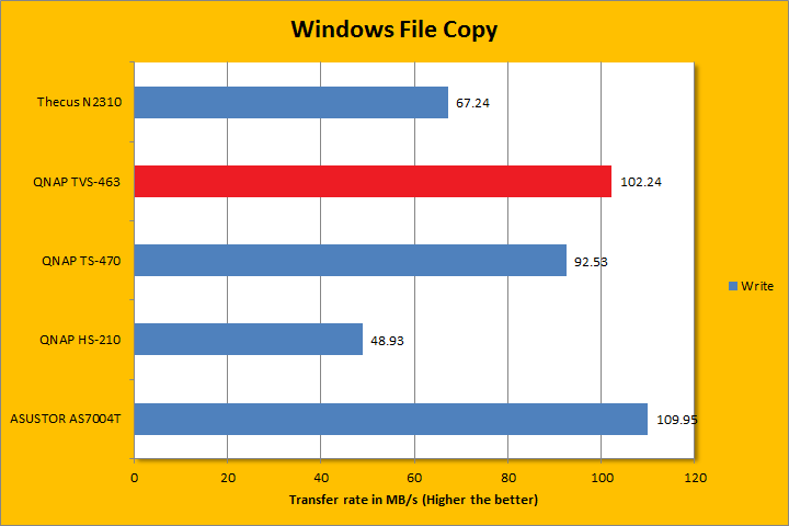 Equipped with the Seagate NAS HDD ST4000VN000 4TB, our QNAP TVS-463 was ready to roll. From our experience in benchmarking, Intel Gigabit LAN adapters -- at least on the client side -- perform much better than their Realtek and Marvell counterparts. Therefore, to prevent any bottlenecks on the client side, our Gigabyte GA-Z97X-UD3H-BK motherboard was connected to the network via its integrated Intel Gigabit LAN adapter. We also conducted the above test on our OCZ Vector 150 240GB solid state drive on the client side to ensure there was nothing limiting the performance of our QNAP TVS-463 than the NAS itself. In turn, the results were quite impressive. As you can see in our graphs above, the QNAP TVS-463 was capable of doing approximately 102.24MB/s for write and 109.32MB/s for read using the Seagate NAS HDD. In fact, it was even faster than the renowned QNAP TS-470, which is regarded as one of the best performing network attached storage systems here at APH Networks. In fact, it got close to the ASUSTOR AS7004T, the fastest NAS in this test. At this point, the bandwidth of Gigabit LAN is more or less the limitation.