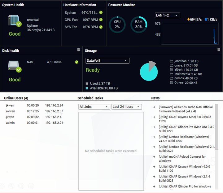 At the bottom half, online users are displayed here. A list with filter shows all the scheduled tasks. Finally, a feed containing latest QNAP news can be seen at the bottom right corner. Overall, I found the dashboard to be extremely useful; it provides vital system statistics all in one easy to access screen.