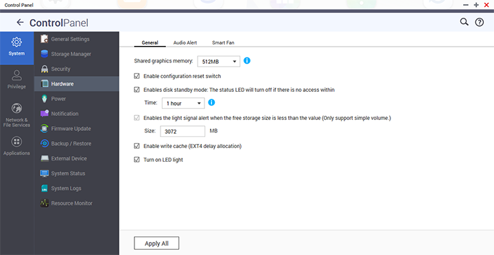 In the control panel, while I will not go over every menu, I will briefly go over most of them, since most of them are self-explanatory anyway. Expanding the first menu item is System Settings. General Settings allows the user to adjust server name and port, date and time syncing options, non-unicode file name encoding conversion, and login screen customization. Under the Security screen are four tabs: Security Level, Network Access Protection to prevent brute force password attacks for various services, Certificate & Private Key from a trusted provider, and Password Policy to set password strength rules. The screenshot above has the Hardware screen shown; permitting the user to configure aspects like disk standby mode, adjust LED brightness, and change fan speed settings.
