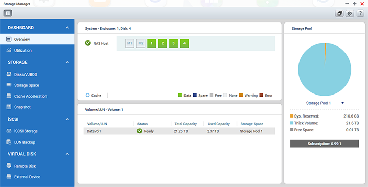 The QTS Dashboard provides a quick view of system status and statistics. At the upper section, the left box gives a high overview of your network attached storage's system and health status. System temperature and fan speed is displayed on the box next to it. The right box shows statistics in a more concise manner with live AJAX graphs; Instantaneous CPU and RAM usage are displayed in a circular graph, while network adapter usage is plotted against time. A pie graph showing hard drive usage occupies the largest tile on the bottom. Different volumes can be selected by a drop-down menu. More detailed information such as total disk usage and individual folder usage can be found to the left and right of the pie graph, respectively. On the left of it is a box that shows HDD health.