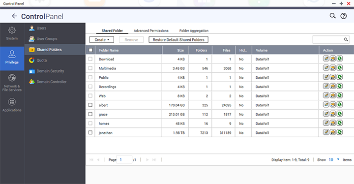 Continuing in the Control Panel, under the Privilege folder tree are six options: Users, User Groups, Share Folders, Quota, Domain Security, and Domain Controller. The Domain Security section provides different authentication options, including local user, active directory, and LDAP authentication. Domain Controller allows you to enable or disable this feature, as well as change its domain name, domain username, and password. In the Users screen, a table lists all users in the system, as well as their respective independent disk quota and account options. You will also have the option to search, create, multiple create, import, and delete accounts here. Five icons represent five different account functions; of which they are Change Password, Edit Account Profile, Edit User Groups, Edit Shared Folder Permission, and Edit Application Privilege. In the Shared Folders screen, it lists an array of folders on the system, similar to the table displayed for the Users screen as shown above. It also shows each folder's size, folders within, number of files, and if it is hidden in their respective column. Again, there are three management options for each folder: Edit Properties, Edit Shared Folder Permissions, and Refresh. Pulling up the Properties menu gives you the option to set the folder's path (If you have multiple single disks installed, you can also set which drive it belongs to), hide or show the folder, as well as locking the file. You can also do stuff enable write-only accesses over FTP and enable sync. The Quota screen allows you to configure universal disk quotas. Individual disk quotas can be set in the Users section.