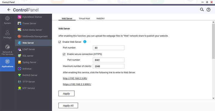Lastly, the Applications submenu shown above is quite straightforward as well. Most of the listed sections, as you can see in our image above, are simply used to enable or disable their respective services. In the Web Server screen shown above, you can enable or disable its HTTP server, set its default public port, enable/disable WebDAV, and upload, edit, or restore the php.ini maintenance file. One to note in particular is the SQL server -- the QNAP TVS-473 has built in MariaDB support, as well as an option to install phpMyAdmin using the App Center, in which we will talk about later.