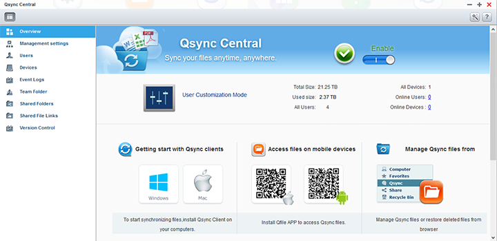 Qsync Central Station 3.0 is a feature to allow you to synchronize files across multiple systems with different file sharing or exchange options. This includes Team Folder, Shared Folders, and Shared File Links, which should be quite self-explanatory. In the latest version of Qsync, you can configure access rights for select users, as well as viewing the connection status of all devices. Client policies can be set so everyone can configure the preferences of their client utilities or in Central Configuration Mode to have everyone use the same configuration settings of the administrator. Version Controls allow you to enable or disable the tracking of different file revisions, set the target folder, as well as setting the maximum number of versions retained. Qsync is very useful feature to include, as many people now have multiple computers plus a tablet or something, and keeping the information synchronized between them is very convenient.