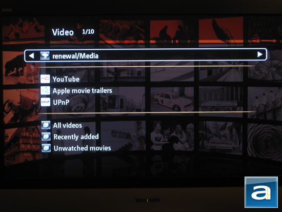 The static image in the large side window as aforementioned becomes the faded background of their respective screen, as seen in our photo above. The Video tab lists the connected disks at the top -- in my case, renewal/Media is my network drive -- followed by YouTube, Apple Movie Trailers, and UPnP after a line break. Under the YouTube option are items including Featured, Most Viewed, Most Recent, Top Rated, History, Search, Downloaded Files, and Log in/My Account. The Apple Movie Trailers screen shows thumbnails of the latest movies available for preview. UPnP streams media from your universal plug and play devices such as Sony's Playstation 3 or Microsoft's Xbox 360. The system actually indexes videos in the specified media libraries, which again I will elaborate in one of the Settings sections in just a moment. I did not find video indexing particularly useful compared to audio indexing, as you are probably better off just navigating through the file browser instead. Indexed video files by default are sorted under categories including All Videos, Recently Added, Unwatched Movies, Favorites, and Rating. The categories can be reduced in device settings. Do note that the browser only lists the files under that folder or index location based on name, and no video preview is available.