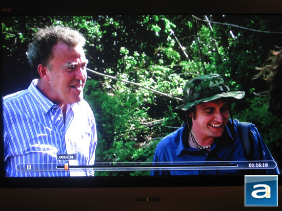 The QNAP NMP-1000 supports MPEG1, MPEG2, MPEG4, XVID, H.264, H.263, WMV9, and VC1 codecs in AVI, MPEG/MPG, VCD (ISO, MPG, NRG), DVD (VOB, IFO, ISO, NRG), WMV, ASF, TP, TS, TRP, M1V, M2V, M4V, M2P, M2T, M2TS, BDMV, MTS, MOV, MP4, RMP4, MKV, TOD, MOD, and 3GP containers. It is capable of playing high definition videos with resolutions of up to 1080p, and of course that includes every standard resolution under it as well. The NMP-1000 network media player supports a generally wide array of video formats, and played pretty much everything I've thrown at it, with a few minor exceptions. It also has a resume play function that remembers where you last left off from the video. Overall, video controls are fairly simple, with the usual hardware skip/play/pause/stop functions on the remote control. If you pause the video like I have for the image above, a transparent progress bar will be shown. The progress bar will disappear immediately after you hit 'Play' again.