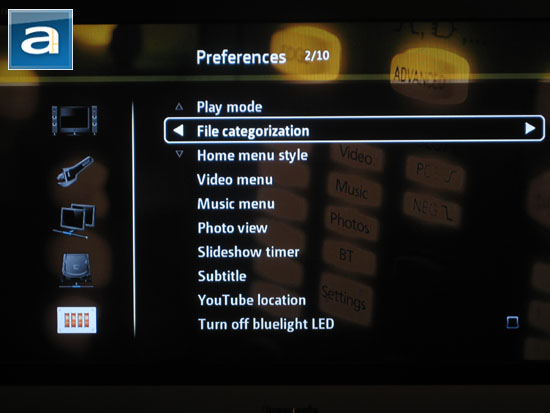 Last but not least is the Preferences tab. Play Mode has options such as normal, shuffle, shuffle repeat, and the like, but the same thing can be adjusted by pulling up a menu when media files are playing as well. File Categorization has options for the user to select which drives to index into the system's library. Video Menu and Photo Menu lets you check off what menu items to display on their respective screens. Meanwhile, if you don't like the QNAP NMP-1000's front blue LED strip, it can be disabled here as well.