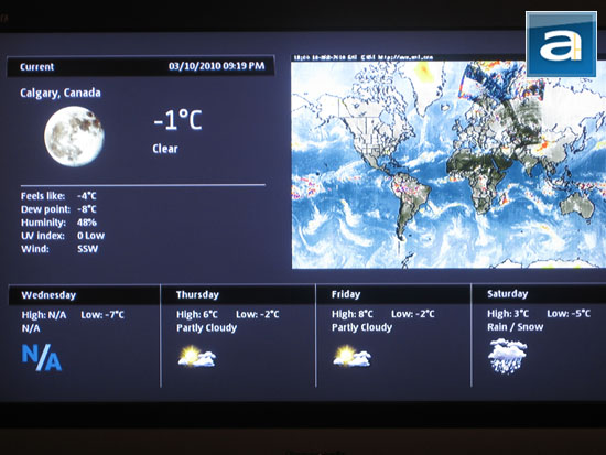 Of which the most interesting is the Weather function under the Network tab. The user has the option of looking up their city sorted by country, or simply search it up by direct text input via the onscreen keyboard. The weather screen does take a couple seconds to load, but it does offer a pretty worldwide weather map in conjunction with current conditions in the upper left corner in large font, followed by the forecast in smaller text across the bottom of the screen. I found this feature a nice touch by QNAP to include in their NMP-1000 network media player.