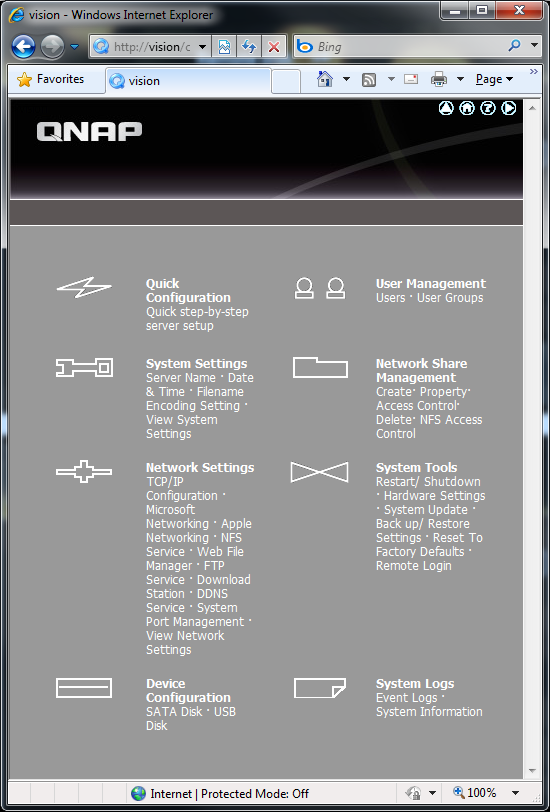 Shown in our screenshot above is the QNAP NMP-1000's web configuration interface. I found it interesting how the company decided to use their legacy user interface in place of their brilliant V3 AJAX web based UI. Most of the standard QNAP NAS functions are available, making the NMP-1000 practically a full featured network attached storage device. What's missing are more advanced features such as web server, remote replication, USB print server, and a handful of other things (You can make a direct comparison to our TS-409 review back written back in September 2008 as a reference to the same interface), but it's really no big deal. QNAP's legacy web interface is relatively easy to navigate and use with a wide array of configuration options, but I don't see why they can't slap on their excellent AJAX based V3 interface since it's already been out for quite a while now.