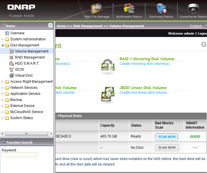 There are five options under the Disk Management expanded menu. The screen shown above is the Volume Management screen. four icons are placed at the top with a brief description on each disk option: Single Disk, RAID 1 Mirroring Disk, RAID 0 Striping Disk, and JBOD Linear Disk. Beneath it is a table containing physical information on installed hard drives, as seen in the image above. The Logical Volumes section displays how the disks are configured, along with three options: Format Now, Check Now, and Remove Now. The QNAP TS-219P II features native support for the EXT4 file system, which we have configured our disks to run on. I have installed a single Western Digital Caviar Black AALS 500GB drive shown in the list above.
