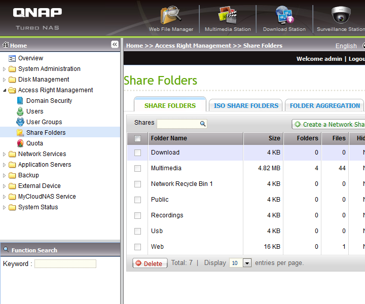 Under the Access Right Management folder tree are five options: Domain Security, Users, User Groups, Share Folders, and Quota. The Domain Security section provides different authentication options, including local user, active directory, and LDAP authentication. In the Users screen, a table lists all users in the system, as well as their respective independent disk quota and account options. You will also have the option to search, create, multiple create, and delete accounts here. Four icons represents four different account functions; of which they are Change Password, Edit Account, User Groups, and Private Network Share. The screen above is is the Share Folders screen, listing an array of folders on the system, similar to the table displayed for the Users screen. It also shows each folder's size, folders within, number of files, and if it is hidden in their respective column. Again, there are four management options for each folder: Properties, Access Control, NFS Access Control, WebDAV Access Control, Microsoft Networking Host Access Control, and Refresh. Pulling up the Properties menu gives you the option to set the folder's path (If you have multiple single disks installed, you can also set which drive it belongs to), hide or show the folder, as well as locking the file. You can also enable write-only accesses over FTP.