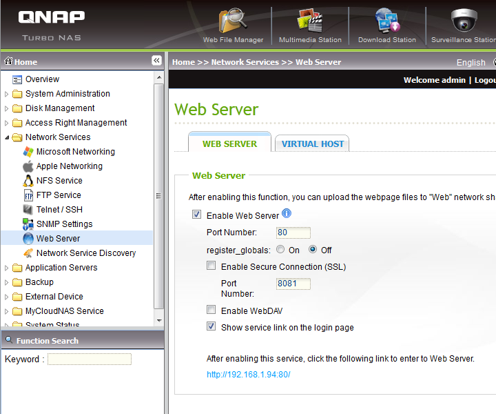 Shown in the screenshot above is the Web Server configuration screen. You can enable or disable its HTTP server, set its default public port, enable/disable WebDAV, and turn on php.ini maintenance. In the Network Service Discovery function, there are two tabs: Enable/disable UPnP discovery service, and broadcasting services through Bonjour. These services include Web Administration, SAMBA, AFP, SSH, FTP, HTTPS, UPnP, and QMobile.