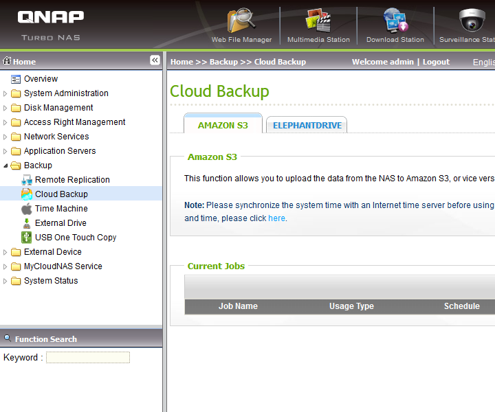 Under the Backups heading are five sections. These include Remote Replication, Cloud Backup, Time Machine, External Drive, and USB One Touch Copy. Remote Replication lets you configure your QNAP TS-219P II to copy data to a remote server of the same NAS series, and backup from remote server to the local server as well. You can also set its port number, and allow/disallow remote Rsync server to back up data to the local system. Cloud Backup provides support for Amazon S3 and ElephantDrive, where you can upload data from your NAS to the respective services, and vice versa.