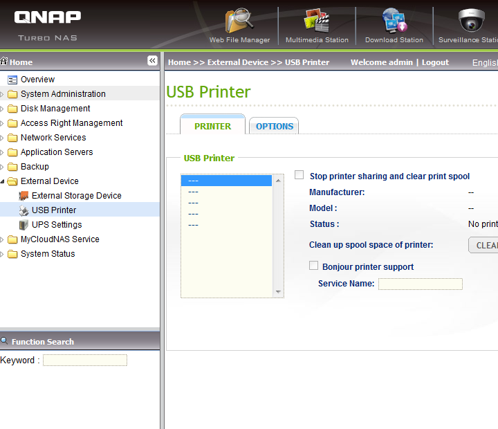 Under External Device, you can configure your NAS to work with, well, external devices -- including management of an external disk drive, USB printer, and connected UPS. The QNAP TS-219P II has a print server function, and the USB printer configuration screen is shown in the image above. Of course, I have no printer connected at the time of taking that screenshot. Other than that, the final screen in this section is the UPS settings, which is quite self explanatory.