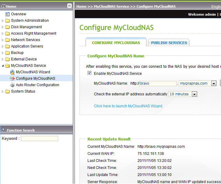 Given the popularity of cloud services nowadays, QNAP took it one step further, and unleashes your NAS from the confinements of your local area network. The implementation of QNAP's MyCloudNAS service is nothing too mysterious, however -- combining a built-in dynamic DNS service, and a wizard that lets you easily get desired services online, it makes it quite a breeze to configure the TS-219P II for access anywhere with internet. For users with UPnP routers, port forwarding setup is no more than a couple of clicks away. One thing that I did find handy was that if you need your files at hand all the time, the web file manager will be an absolutely invaluable asset. Additionally, since Multimedia Station is part of the MyCloudNAS program, you can now stream music to any computer with a web browser that supports Flash (Or even your smartphone with the QMobile app installed).