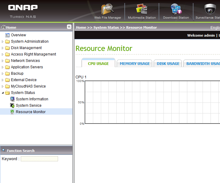 Last on the menu are System Status options under three specific sections: System Information, System Service, and Resource Monitor. The System Information screen provides a list of quick information on your NAS in text form, such as CPU usage, total memory, free memory, Ethernet adapter's packets sent or received, CPU temperature, system temperature, independent hard drive temperature, system uptime, and system fan speed. System Service displays statuses of various services under different tables. The Resource Monitor screen has live AJAX graphs showing CPU usage, memory usage, disk usage, bandwidth transfer, and running processes separated into their respective tabs; as shown in our screenshot above.