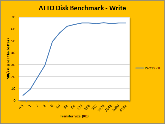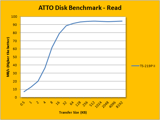 ATTO Disk Benchmark provides important insight into evaluating NAS performance. It is especially valuable since it is not local hard disk or protocol limited like Windows File Copy -- but rather the network adapter itself. After first using it in our QNAP TS-559 Pro+ review last year, ATTO has been an integral part of our storage benchmarks; used in everything ranging from USB flash drives to solid state disks. Anything from the 32K point and on, you will get 'only' a write speed of anything over 60MB/s, while the read speeds venture into a rate of just over 90MB/s, and levels out to 94MB/s.