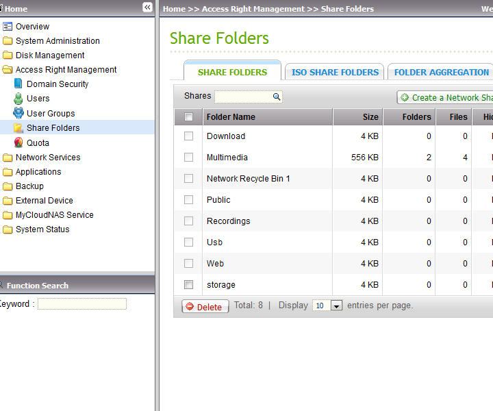 Under the Access Right Management folder tree are five options: Domain Security, Users, User Groups, Share Folders, and Quota. The Domain Security section provides different authentication options, including local user, active directory, and LDAP authentication. In the Users screen, a table lists all users in the system, as well as their respective independent disk quota and account options. You will also have the option to search, create, multiple create, and delete accounts here. Four icons represent four different account functions; of which they are Change Password, Edit Account, User Groups, and Private Network Share. The screen above is the Share Folders screen, listing an array of folders on the system, similar to the table displayed for the Users screen. It also shows each folder's size, folders within, number of files, and if it is hidden in their respective column. Again, there are four management options for each folder: Properties, Access Control, NFS Access Control, WebDAV Access Control, Microsoft Networking Host Access Control, and Refresh. Pulling up the Properties menu gives you the option to set the folder's path (If you have multiple single disks installed, you can also set which drive it belongs to), hide or show the folder, as well as locking the file. You can also enable write-only accesses over FTP.