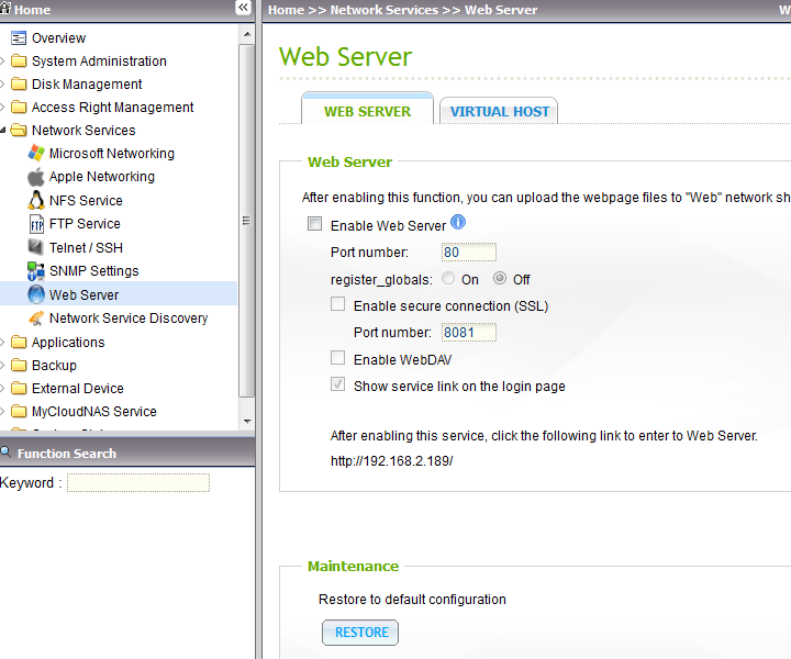 Shown in the screenshot above is the Web Server configuration screen. You can enable or disable its HTTP server, set its default public port, enable/disable WebDAV, and turn on php.ini maintenance. In the Network Service Discovery function, there are two tabs: Enable/disable UPnP discovery service, and broadcasting services through Bonjour. These services include Web Administration, SAMBA, AFP, SSH, FTP, HTTPS, UPnP, and QMobile.
