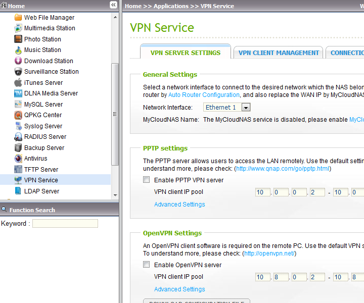 Other applications of interest include Syslog, RADIUS, and TFTP servers; along with a built in antivirus for an extra touch on security. The RADIUS server is an integrated version of the open source FreeRADIUS software; while its antivirus feature runs off ClamAV. Our screenshot above shows the VPN service configuration screen on our NAS.