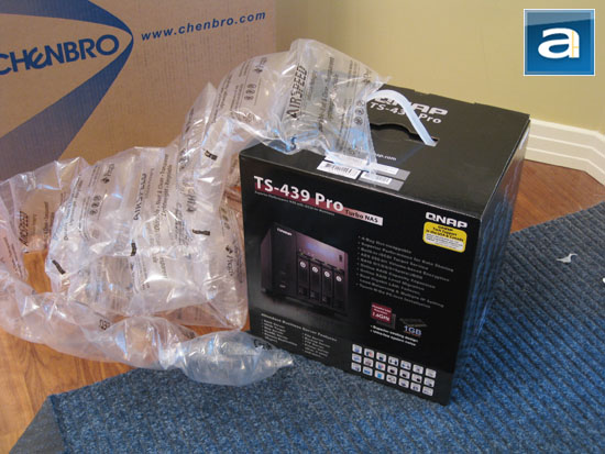 I whipped out my knife to cut open its seal at the top to unload its contents. A standard sized retail package of QNAP's TS-439 Pro network attached storage system sat humbly in the corner of the box, while the rest of the space -- remember, this is an ATX chassis box, after all -- which accounts for 75% of the box interior, is neatly filled with large air bubble strips. This kind of made me wonder what's with all the excessive space, since that exponentially increases shipping cost. This is especially true when you use the near-fastest shipping method with the courier. Other than that, our review unit of QNAP's TS-439 Pro arrived in pristine condition, retail box and all haha.