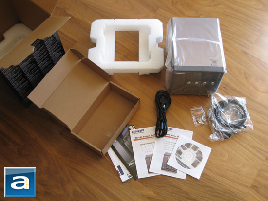 Opening the retail box reveals the QNAP TS-439 Pro unit clipped between two large Styrofoam brackets, and wrapped in a large plastic bag -- to ensure there are no bumps and scratches occurring during transport. Its accessories box is neatly placed on the side. Overall, it is very well packaged in both a practical sense and aesthetically speaking manner.